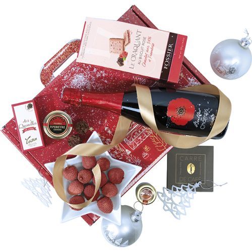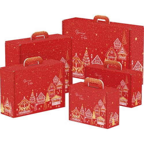 Cutie servieta dreptunghiulară din carton Bonnes Fêtes, roșu/alb/auriu, 34,2x25x11,5 cm, CV040M